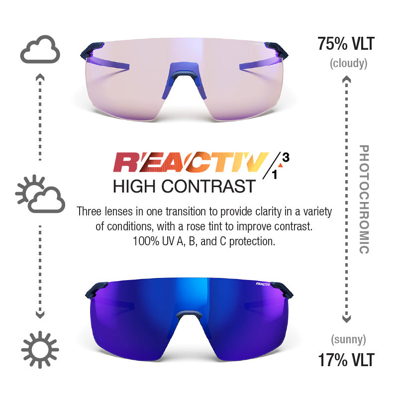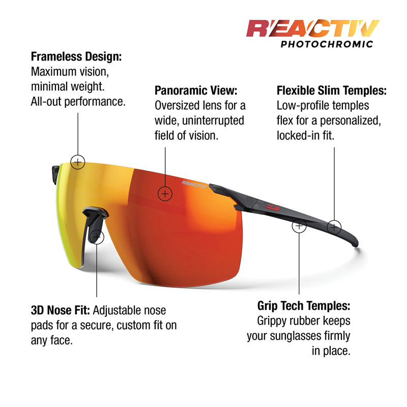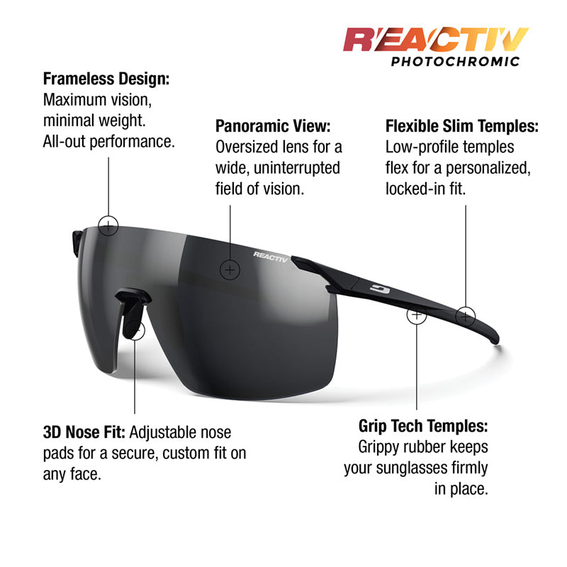 Julbo's industry-leading REACTIV photochromic lenses adjust to changing light conditions and offer outstanding optical quality, making them the best photochromic lens on the market.