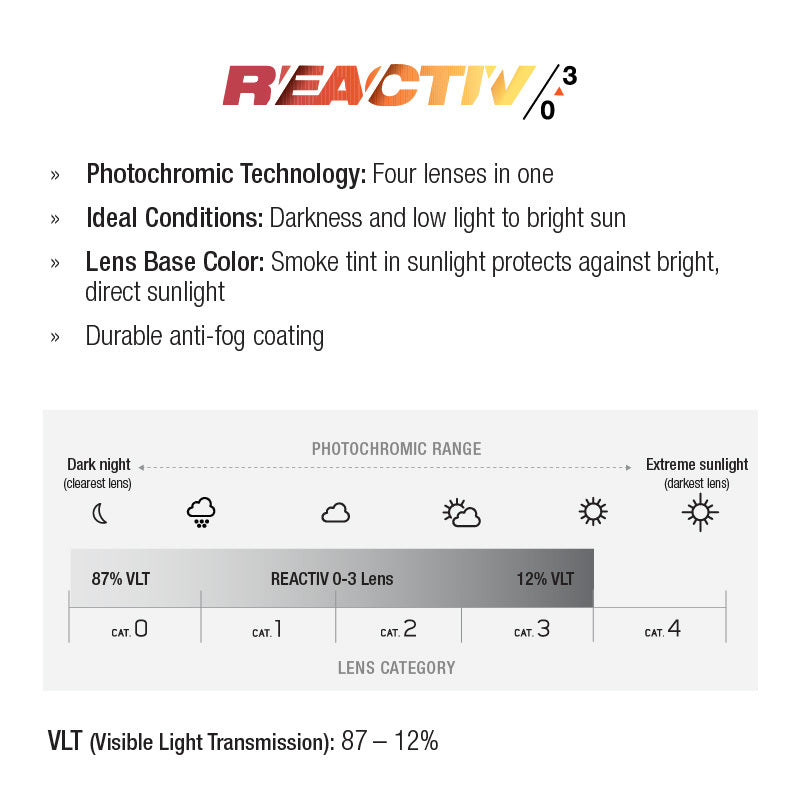 Julbo's industry-leading REACTIV photochromic lenses adjust to changing light conditions and offer outstanding optical quality, making them the best photochromic lens on the market.